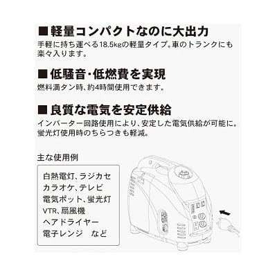 インバータ式ですから供給される電気も安定していますので、家電製品、電動工具と利用機種を選びません。