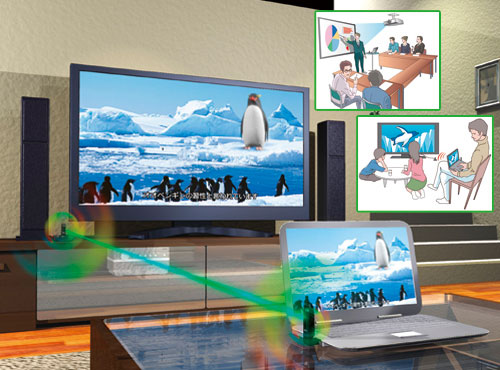 通信方式はUWBを採用、Bluetoothや無線LANより高速通信・低消費電力・その他無線機器との混信がないなどのメリットがあるものです。1920×1080ドットのフルHD映像と音声を伝送可能になり、DVDは最高16bit/48kHzの音声もあわせて出力できます。