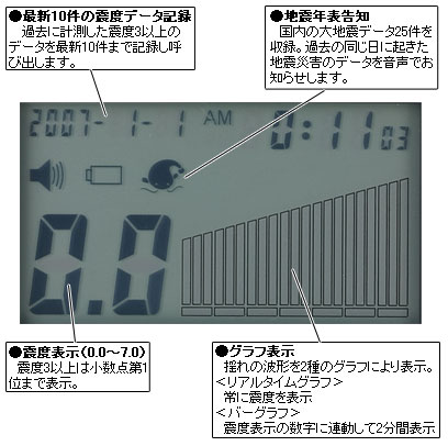 メディアおける震度情報はテレビよりラジオのほうが早いものですが、この震度計は簡易式ながらラジオよりも速く震度を表示してくれ、大きな揺れの場合には、音声によって消火や避難など6種類の警告を発してくれます。