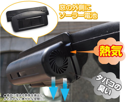 太陽電池を電源に、停車時の自動車内の熱気や汚れた空気を吐き出させる、いわば自動車用換気扇です。