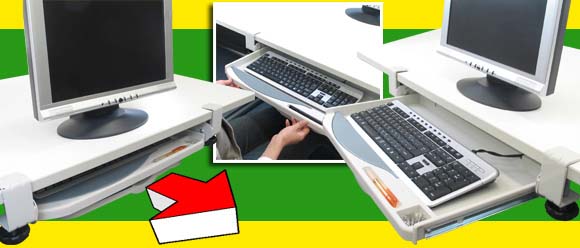 デスクトップ型パソコンのキーボードやマウスを、デスク下に仕舞える後付けのトレイです。