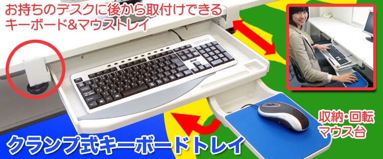 キーボードとマウスがセットできるトレイを、クランプでデスク下に簡易的に留める仕立てで、デスク上のスペースを広く使えるようになるものですが、トレイは引き出せる仕掛けになっていますので、使いたいときはサッと引き出してキーボードとマウスが使えます。