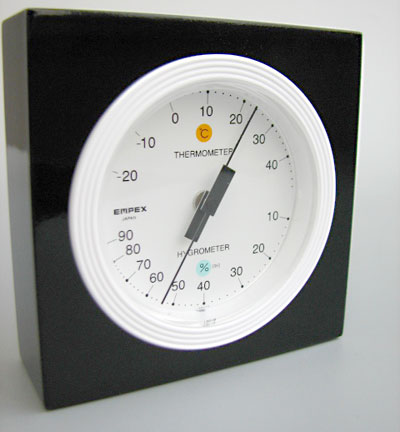 白黒のモノクロデザインでコンパクトながら機能性重視で視認性が高く、日本製で品質もしっかりした温・湿度計をベースに、天然木枠で演出したもので、落ち着きあるインテリア性のあるものです。
