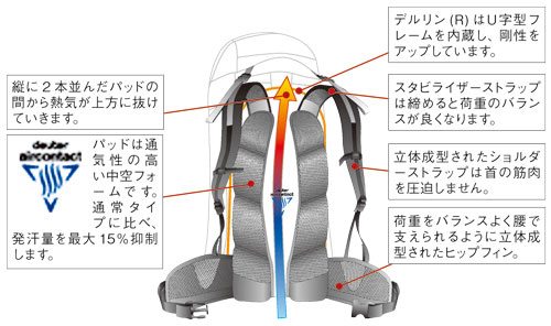 20リットル容量で日常から旅行、日帰り登山まで幅広く使えるタイプのもので、何よりの特徴は背中と接する部分が独自のエアコンタクトトレイルシステムを採用し、熱さに蒸れにくいところです。背中、とりわけ肩と肩甲骨あたりある感冒筋は体温調節に肝要な部分、そこを従来のバックパック、リュックなどは覆ってしまうために熱が籠もり、疲労を導くことすらありますが、この品は先述の特殊構造により、身体の動きを利用してポンプのように熱気を吐き出す仕掛けになっています。