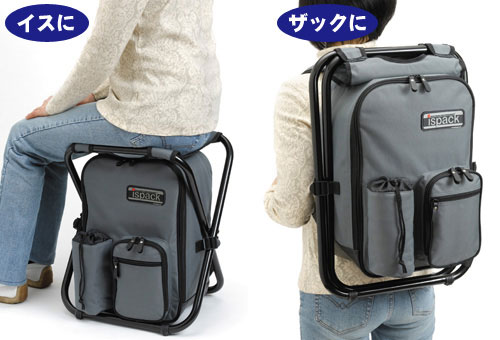 基本は17リットルのザックですが、フレーム状に折りたたみイス(チェア)を備えているもので、アウトドアやレジャー、ハイキングなどの途中の一休みに、また写真撮影の際には腰を落ち着けてシャッターが押せるなどに利用できます。また、スポーツ観戦、釣りなどに用いられても結構です。