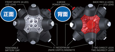 何やら磁石部分の突起が、物騒な例えをすめなら機雷を思わせないでもない品ですが、これが金属部だけでなく、ただ置くだけでも巧みに角度をつけて設置できる仕掛けで、LEDライトについては8個の白色LEDと4個の赤色LED(点滅モード有)を備え、例えば自動車整備に使うなら、暗い場所でのタイヤ交換やチェーン装着時のみならず、エンジンルームの作業でも用いれ、また、赤色LED(点滅可能)を使えば、ハザードランプとして緊急時に使えます。もちろん、日常的にも使い方次第で幅広く利用できます。