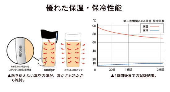 この品は、デザイン性にこだわりながらも、冒頭と記した湾プッシュ開閉式の飲み口で、その密閉性も高く、転がしてもこぼれる心配なしで、保温及び保冷性もステンレスの真空二重構造で高いものですので、オフィスに持ち込んのも、アウトドアに持ち出しのも、自由。
