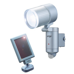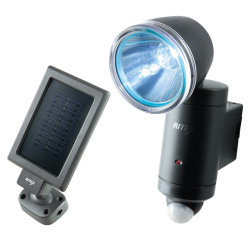 ソーラー充電式。高輝度3W LED球使用。ソーラー受電式。ボディに備わる赤色LEDは常時点滅し、センサーが侵入者を検知すると高速点滅に変化します。