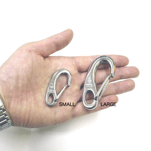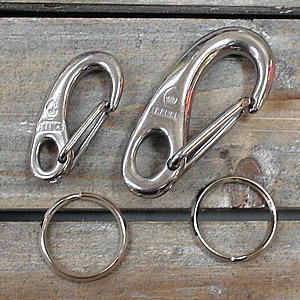 この品は、1911年創業のマリン用品メーカーらしい堅牢な作りがなされており、実際、プロのヨットマン達から支持され続けている本物のカラビナだけに、ロープを固定するために使用されるためにバネもしっかりと仕立てられて、重厚なステンレススチール製の美しいフォルムには紛い物にない屹立したものがあります。
