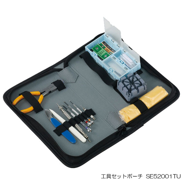 クォーツから自動巻き、手巻きをとわず電池交換からベルト調整までができるツールが揃って、収納とともに携行にも便利な専用ポーチ収められた腕時計用の工具セットです。