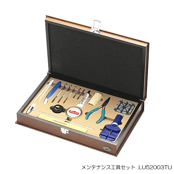 クォーツから自動巻き、手巻きをとわず腕時計の電池交換からベルト調整までができるツールが揃って専用ボックスに収められた工具セットです。