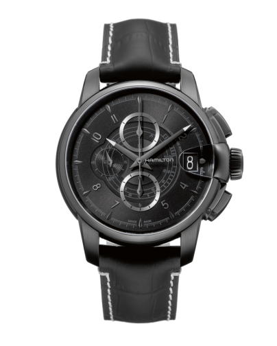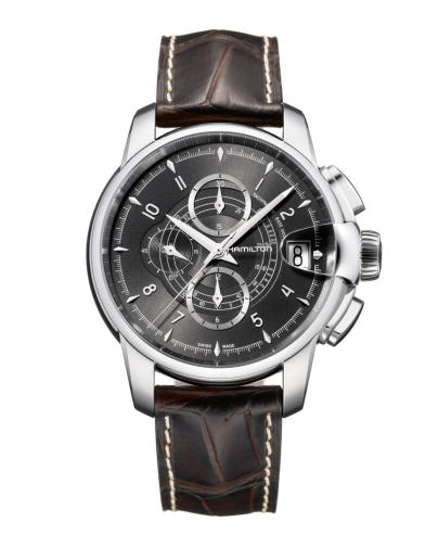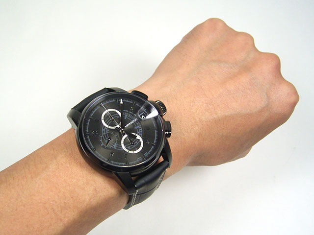 ガラスにレンズを備えてカレンダーの視認性を高くしてあるのに加え、カレンダー横に見えるHAMILTONのロゴは文字盤ではなく、ガラスに刻印してあるという凝った演出がされています。