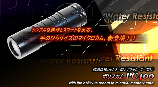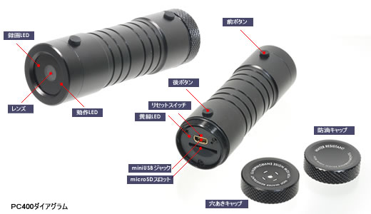 直系23(最大部)×70mmの円筒状の小型ビデオカメラです。防滴仕様で雨中での使用に耐えるもので、手に持ったり、ポケットに着けて撮影する以外に、自動車内に設置したり、ヘルメットに装着したりできる付属マウント(アタッチメント)も備えていますので、調査や作業現場の記録から、モータースポーツ、アウトドアでの撮影など様々な状況で利用できます。