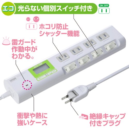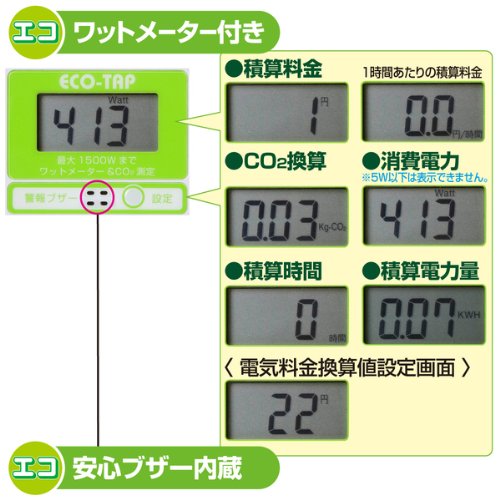 消費電力、積算時間、積算電力、CO2換算、積算料金の5種類の表示が可能で節電に役立つ電源タップです。
