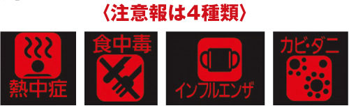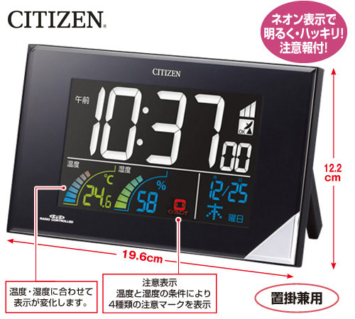 インフルエンザ、カビ、ダニ、食中毒、熱中症と、発生しやすい温度と湿度から判断しての注意報表示機能を備えた掛け置き兼用電波めざまし時計です。