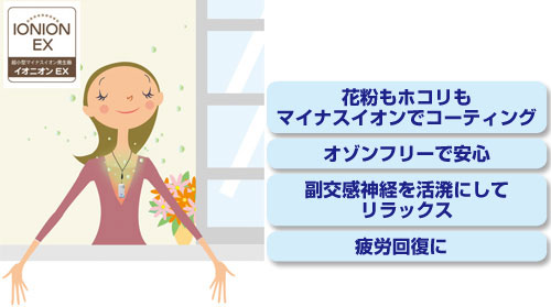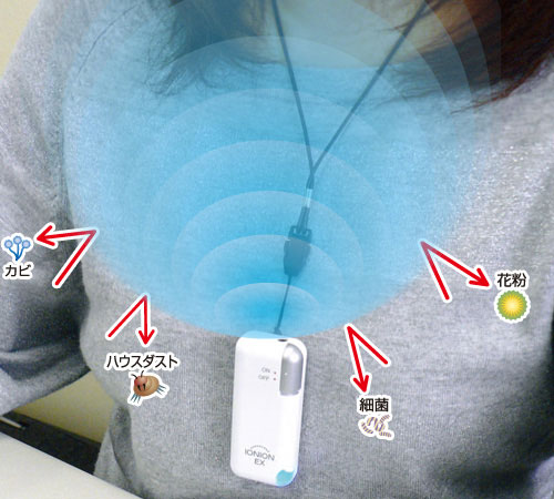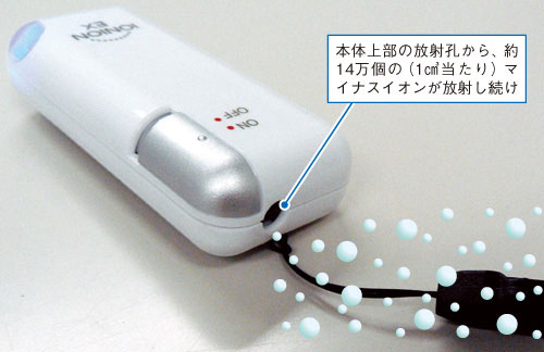 いわゆるプラズマクラスーだのナノイーだのといったものと同様に、マイナスイオンを発生させ、この場合は首から吊り下げている人の周辺、特に顔の周辺の空気中に漂うホコリやウィルス、花粉など有害物質、または悪臭を抑制するものですが、この品は、JIS基準の測定でイオン発生が認められた初の携帯型マイナスイオン発生器で、先述の有名メーカーの携帯型と違って、時に不快に思えることもある音がしないという特徴を備えます。