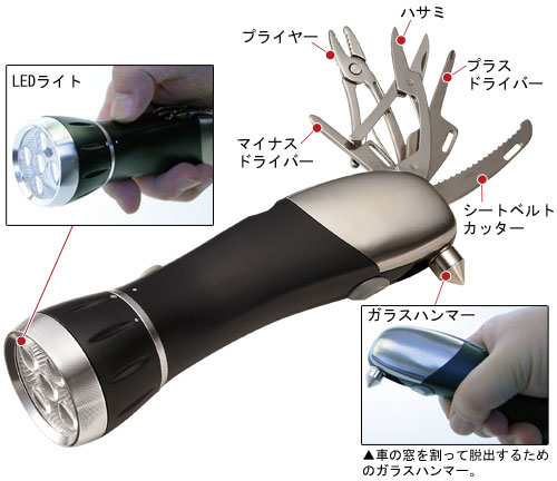 点滅及び白赤切り替え機能を有するLEDライトを基本として、尻部にシートベルトカッター、ガラスハンマー、プラスドライバー、マイナスドライバー、ハサミ、プライヤーを内蔵して、自動車への常備から家庭に備えて非常時にも役立つ仕立てで、キャンプなどアウトドアフィールドで、自転車やオートバイ(バイク)でのツーリングに携行してもいいものになっています。