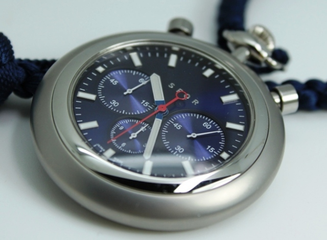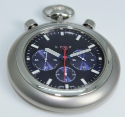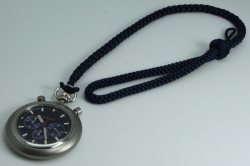 懐中時計、ポケットウォッチというと、調度性、またはシンプルさを表したものが多いですが、この品はクロノグラフ腕時計からベルトを外して懐中時計に仕立てたといった印象で、外観にそぐわず5気圧の防水構造を備えます。
