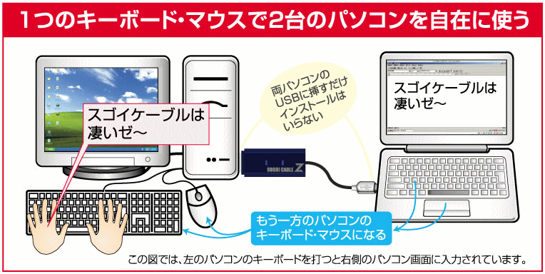 例えば新しいパソコンを買った時など、古いパソコンの中に保存していたデータやファイルを移動させるには、一般的には、USBメモリーなどに保存してから新しいパソコンにデータやファイルを移行させなければなりませんが、このケーブルなら、2台のパソコンを双方のUSBポートを利用してつなぐだけで、専用画面やドライバーのインストールの必要なく、一方のキーボードおよびマウスの操作により、ファイルのコピーや、トラッグ&ペーストを含めて、簡単に移動させることができます。