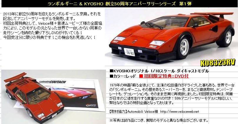 京商とランボルギーニ社がともに2013年に50周年を迎えるのを記念して製作された、50周年記念第1弾モデル、カウンタックLP500、ウォルター・ウルフ仕様のレッドタイプです。