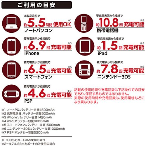 USBポートおよびDCポートの出力に対応することから、ノートPCに電源供給しながら、携帯電話機などの充電が可能となっています。