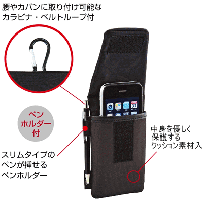 縦型で開閉口を閉め忘れた際にも中のものが飛び出し難くなっており、ベルトループとカラビナを備えますので、ベルトを利用して腰に留めたり、カラビナカバンなどにぶら提げて使うこともでき、ビジネスでは必携のペンを留めておけるペンホルダー付きになっています。