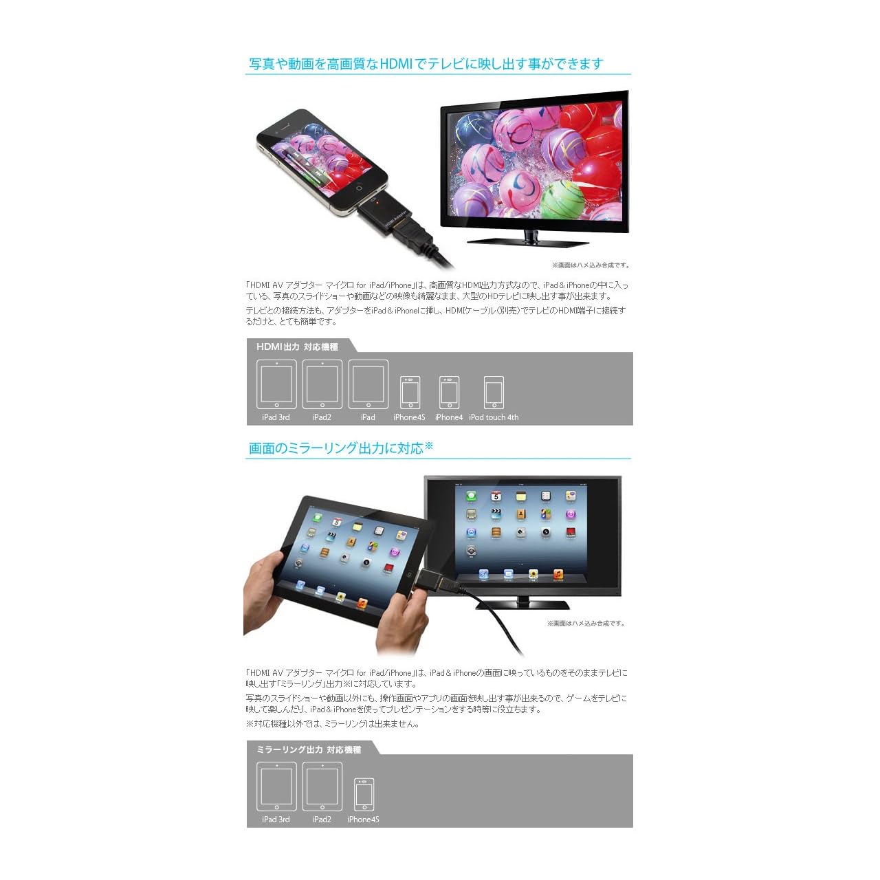 iPadおよびiPhoneの画像や動画を、テレビやモニターに高画質のHDMI出力方式で出力できるAVアダプターです。