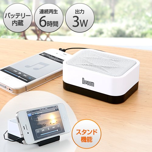 本体に備わるステレオケーブルでイヤホンジャックを利用する手軽なもので、サイズはW80×D60×H32㎜として、本体の下部からスタンドを引き出してスマートォンをセットできる仕立てになっており、スピーカーは3Wで、バッテリーはフル充電で連続6時間の利用が可能です。