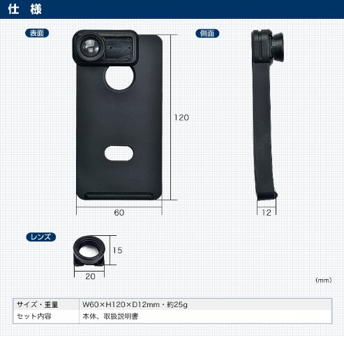 ケース部のサイズはW60×H120×D12㎜で、レンズ部のサイズはW20×H15㎜、重さは25gです。