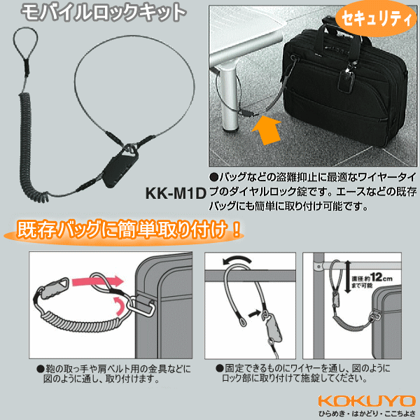 ダイアルロックは3桁で、ワイヤーは伸縮性のあるコイル式となっており、対応する柱などのサイズは最大で直径12㎝程度までになっています。