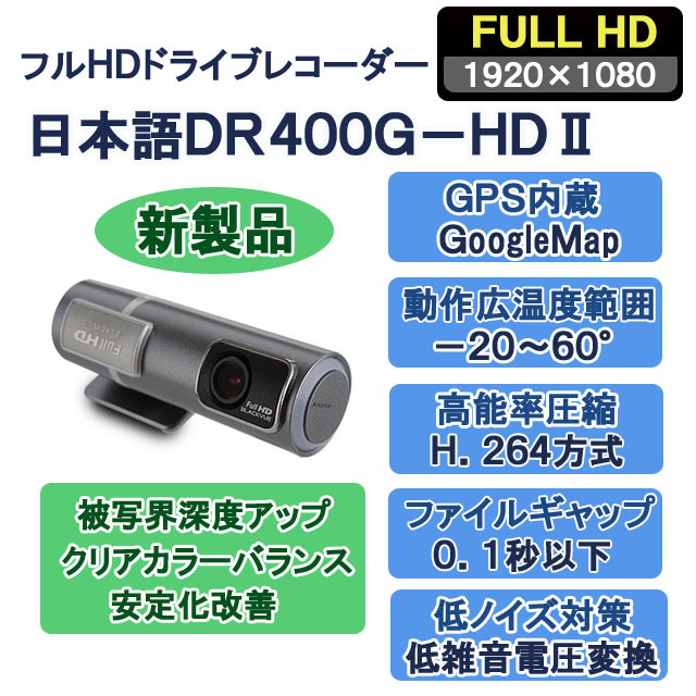 小型軽量でありながらフルHD 1080p/30fpsの高画質モデルですが、DR400G-HD2となり、前モデルに比べて、被写界深度の広いレンズを採用してピントが合う範囲を拡大、カラーバランスを改善して更にクリアな映像が撮影できるようになっており、また、内蔵するGPSによるGoogle Mapとの連携表示においては安定動作対策されるなど、内容的に磨きがかかっています。