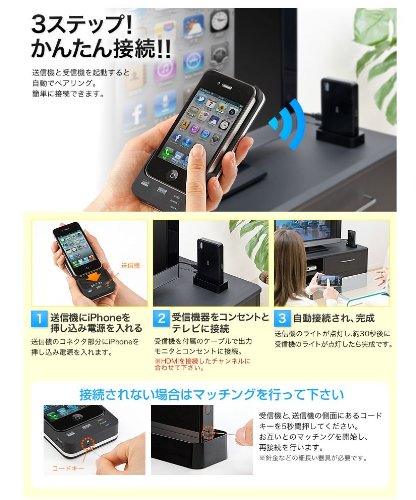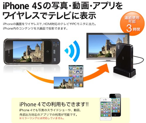 対応機種は、送信機側がiPhone 4S/4で、受信機側となるテレビやモニター(ディスプレイ)は当然のようにHDMI入力端子装備が必須になります。