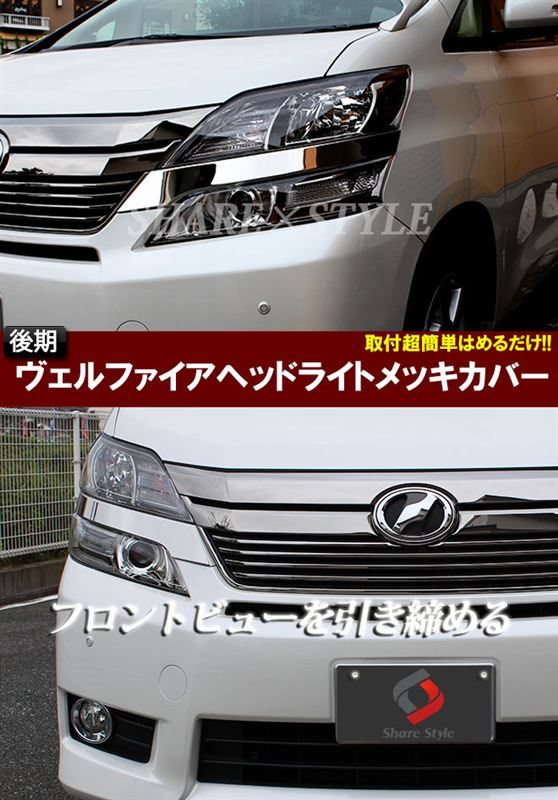 トヨタのプレミアム・ミニバン、ヴェルファイア後期モデル用の、ヘッドライト部に簡単に装着できるクロームメッキカバーです。
