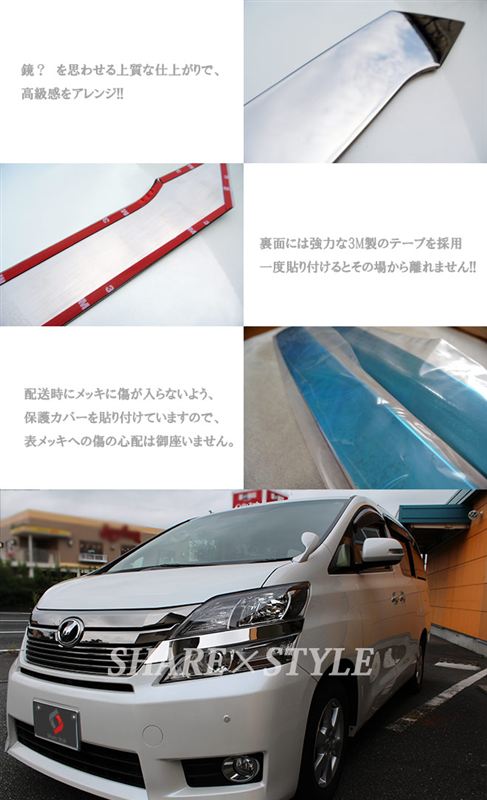 既に豪奢な仕立てのヴェルファイアですが、人気車種でもあることから街を走れば同じグレード、同じオプションをつけた車とかちあうこともしばしば、さりとて大枚を叩いてエアロ化、または車高調整キットをつけてローダウン化しては些か趣味の悪い印象を受ける方も少なくない、そこでこの品は全グレード対応、ベースがステンレス製のしっかりしたものながら、備え付けられている両面テープを剥がして貼り付けるだけの簡単装着で、さりげなく品良くオリジナリティを加味できるものになっています。