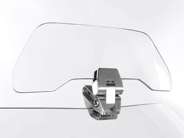 この品は、そういう僅かな形状でも空力的効果が違ってくること、とりわけ高速走行においてはその効果が大きくなることに着目して作られたもので、機種のスポイラー形状、そしてライダーの体格に合わせて、角度調節もできるものになっています。スクリーンのアフターパーツメーカーとしては実績のあるワンダーリッヒ製ですので、透過性、耐久性ともに高いものです。