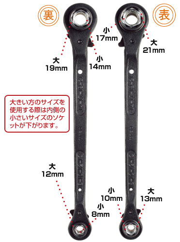 大小のメガネ部分は8×12、10×13、14×19、17×21mmと変えられ、8サイズのボルトに対応します。