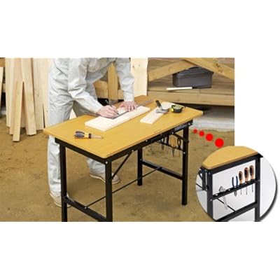 脚部が折り畳め、ハンドルを備えて持ち運びに便利な仕立てで、天板は厚み12㎜、フレームに工具差し収納部も備えるもので、耐荷重は100㎏と、重い材木や電動工具にも耐えるものでありながら、価格は手頃なものになっています。