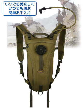 米軍を始め、欧州、中東、アジアなど各国の軍隊や警察が採用する、ソース社製のバックパックタイプの水筒です。