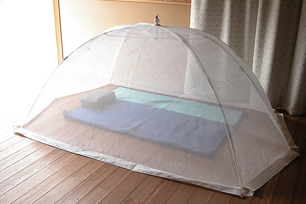 一見、食卓の料理を埃や虫から守る蝿帳(はいちょう)のようですが、本格的な蚊帳を部屋に吊る労苦を考えると、傘のように開けて、また傘のように折り畳めることから、使わないときは部屋の片隅などに立てかけておけることも含めて、「ちょっと横になりたい」というときにはとりわけ便利なものになっています。