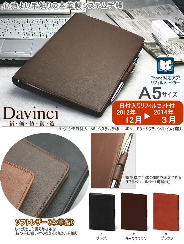 本革のしっとりした手触りと高級感が味わえ、日付入りのマンスリーおよびウィークリースケジュール欄を始めとしてiPhone対応アプリ、リフィルストッカー対応のリフィルが付属した、スタンダードなデザインのA5サイズのシステム手帳です。