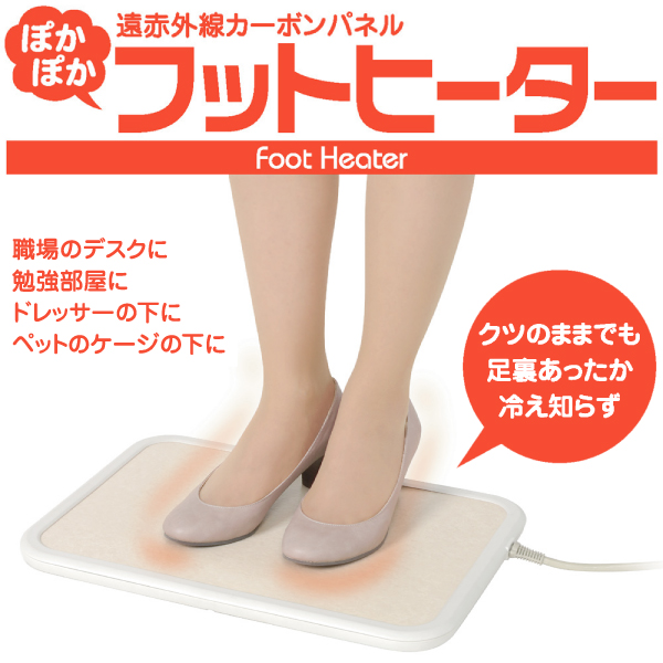 遠赤外線カーボン発熱体を搭載して靴を履いたままでもデスクの下などに敷いて使えるフットヒーターです。